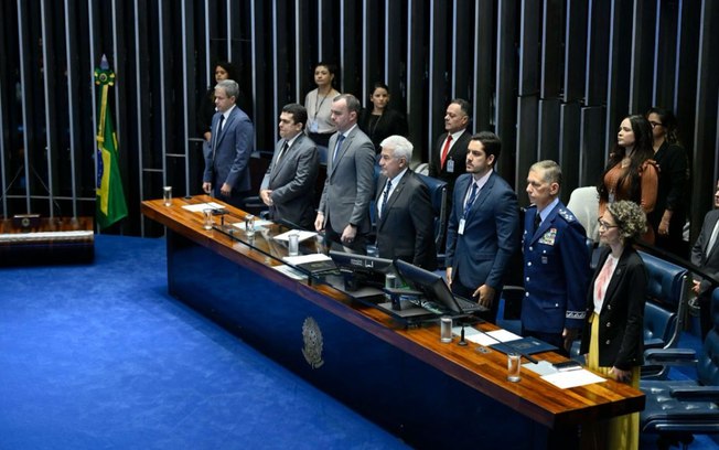 Plenário do Senado Federal durante sessão especial destinada a comemorar os 20 anos da Agência Nacional de Aviação Civil (Anac). Em posição de respeito parlamentares, autoridades e convidados acompanham execução do Hino Nacional. Mesa: presidente da Associação Brasileira das Empresas Aéreas (Abear), Juliano Noman; diretor-presidente da Agência Nacional de Aviação Civil (Anac), Tiago Chagas Faierstein; secretário Nacional de Aviação Civil (SAC) do Ministério de Portos e Aeroportos (MPor), Daniel Ramos Longo; requerente e presidente desta sessão especial, senador Astronauta Marcos Pontes (PL-SP); secretário desta sessão; chefe do Estado-Maior da Aeronáutica (Emaer), tenente-brigadeiro do Ar Walcyr Josué de Castilho Araújo; diretora da Agência Nacional de Aviação Civil (Anac), Mariana Altoé.Geraldo Magela/Agência Senado